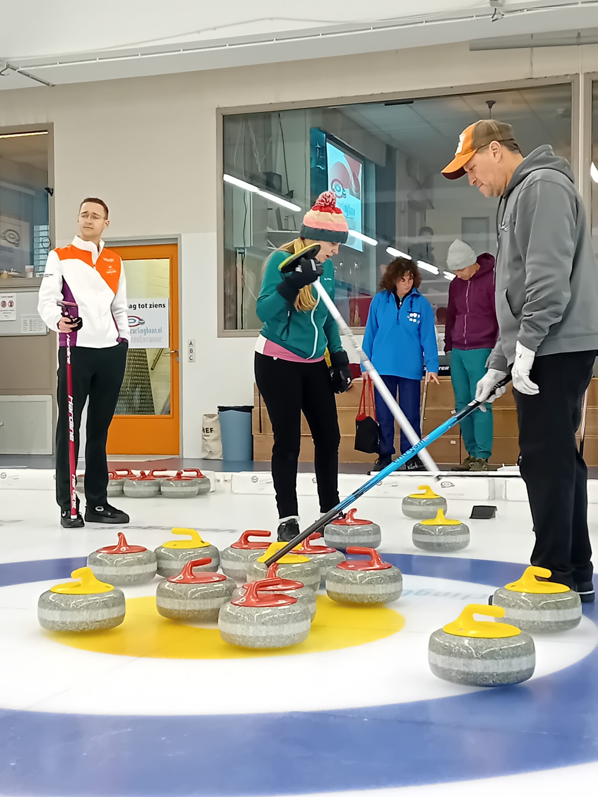 Afgelopen zondag werd onder begeleiding van Floris Ros en Bart Klomp de eerste breedtesportdag van dit seizoen gehouden in Zoetermeer. Een grote groep van maar liefst 16 enthousiaste curlers van alle clubs uit Nederland kregen tips over hun balans, veegtechniek en skippen. Na afloop van de twee aansluitende ijs sessies van elk 2 uur lang, met lunchpauze, was er nog tijd voor een korte analyse van de recent gespeelde OKT-wedstrijd tussen Nederland en China.